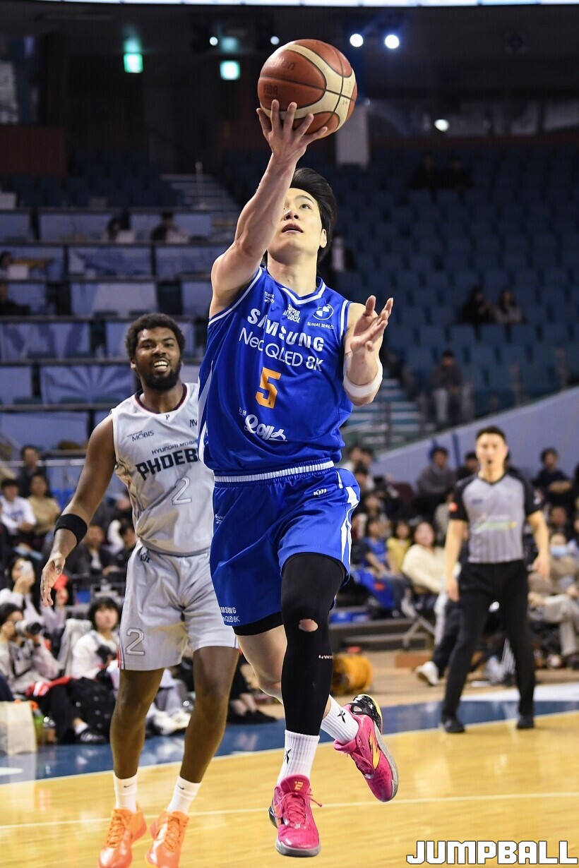 [점프볼=잠실/유용우 기자] 23일 잠실실내체육관에서 열린 2025-2026 LG전자 프로농구 서울 삼성과 울산 현대모비스의 경기, 삼성 한호빈이 빠르게 공격을 전개하며 레이업을 올리고 있다.
