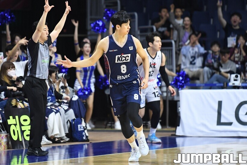 [점프볼=부산/유용우 기자] 27일 부산사직체육관에서 열린 2025-2026 LG전자 프로농구 부산 KCC와 수원 KT의 경기, KCC 윤기찬이 3점슛을 성공하고 세레머니를 펼치고 있다.