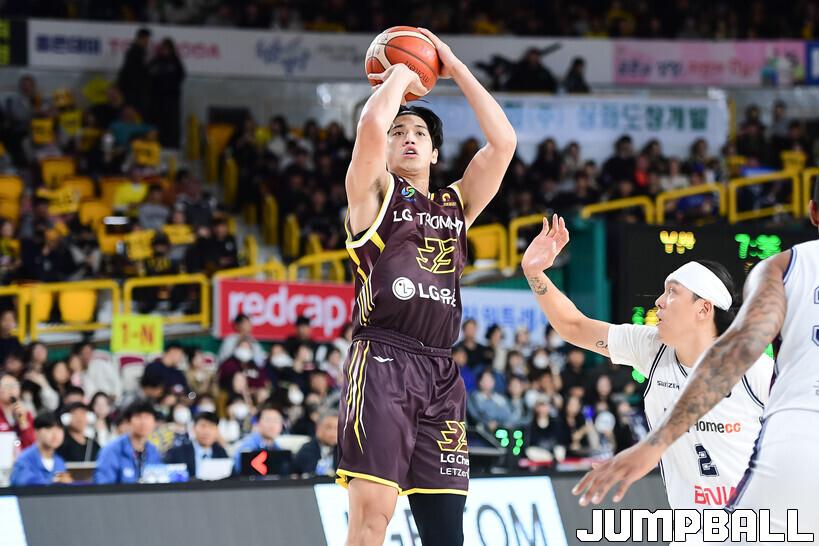 [점프볼=창원/박상혁 기자] 10일 창원체육관에서 열린 2025-2026 LG전자 프로농구 창원 LG와 부산 KCC의 경기, LG 칼 타마요가 슛을 시도하고 있다.