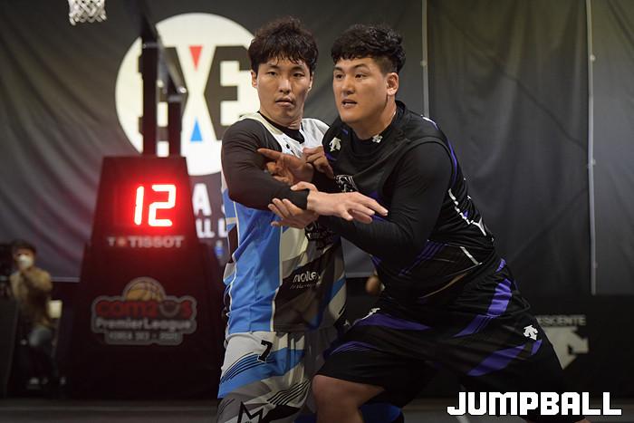 [점프볼=고양/박상혁 기자] 2일 고양 스타필드 스포츠 몬스터 특설코트에서 열린 '컴투스 KOREA 3X3 프리미어리그 2020' 1라운드 경기, 아프리카프릭스의 노승준과 데상트범퍼스 석종태가 몸싸움을 벌이고 있다.