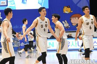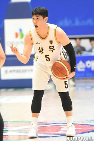 [점프볼=제천/박상혁 기자] 7일 제천체육관에서 열린 2024 DB손해보험 KBL 컵대회 in 제천 대구 한국가스공사와 상무의 경기, 한국가스공사 신주영이 상무 전현우와 인사를 나누고 있다.