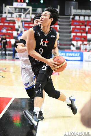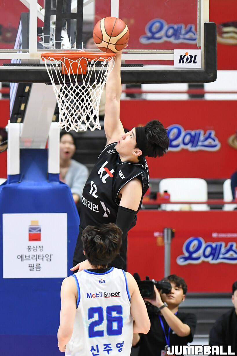 [점프볼=수원/박상혁 기자] 9일 수원 KT 소닉붐 아레나에서 열린 2023-2024 정관장 프로농구 수원 KT와 대구 한국가스공사의 경기, KT 문정현이 덩크슛을 시도하고 있다.