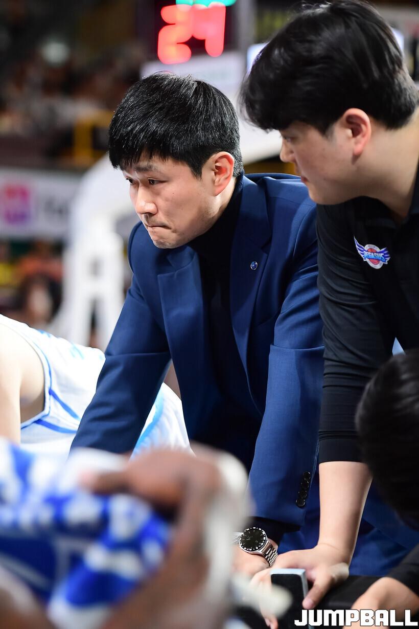 [점프볼=창원/박상혁 기자] 23일 창원체육관에서 열린 2025-2026 LG전자 프로농구 창원 LG와 대구 한국가스공사의 경기, 한국가스공사 강혁 감독이 선수들에게 지시를 하고 있다.