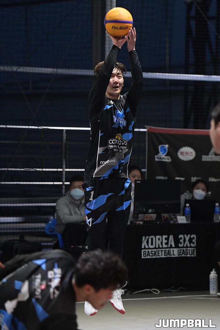 [점프볼=고양/박상혁 기자] 2일 고양 스타필드 스포츠 몬스터 특설코트에서 열린 '컴투스 KOREA 3X3 프리미어리그 2020' 1라운드 경기, 아프리카프릭스 김동우가 슛을 시도하고 있다.