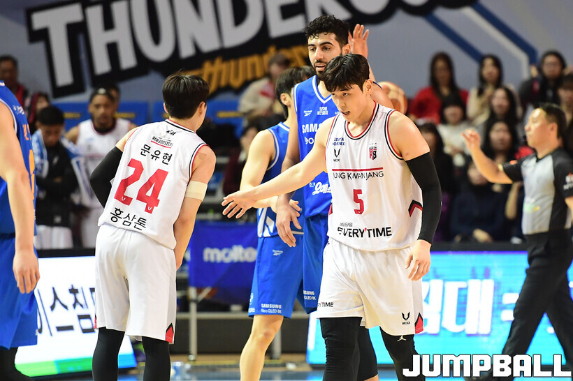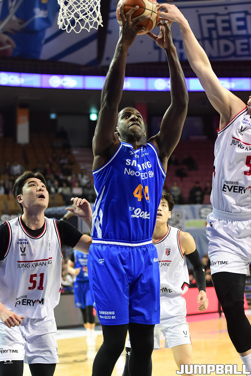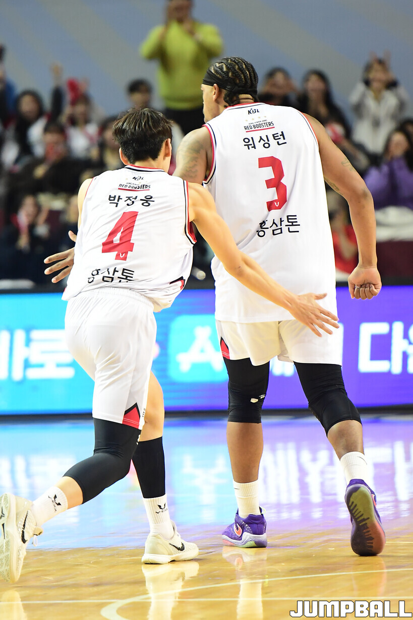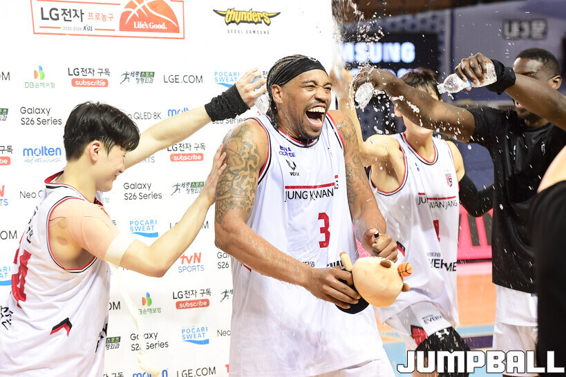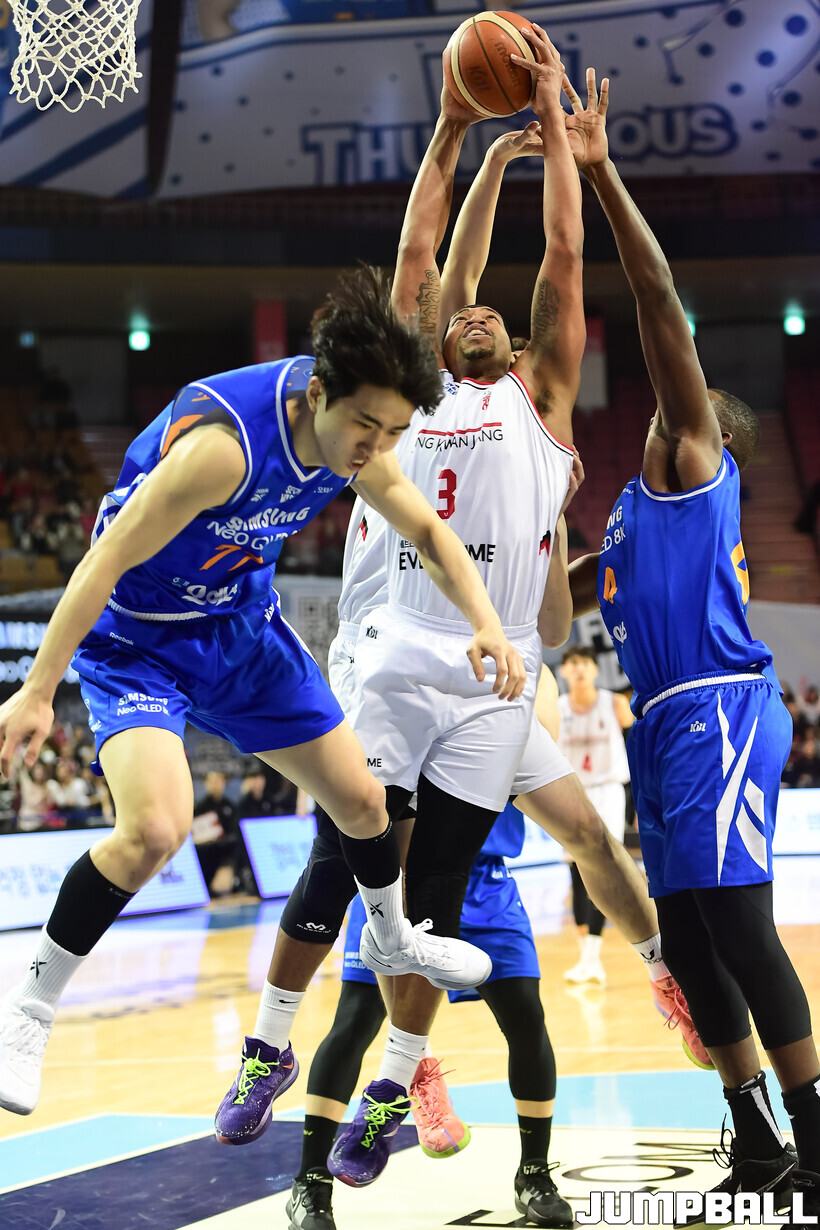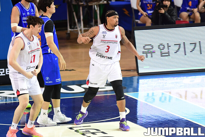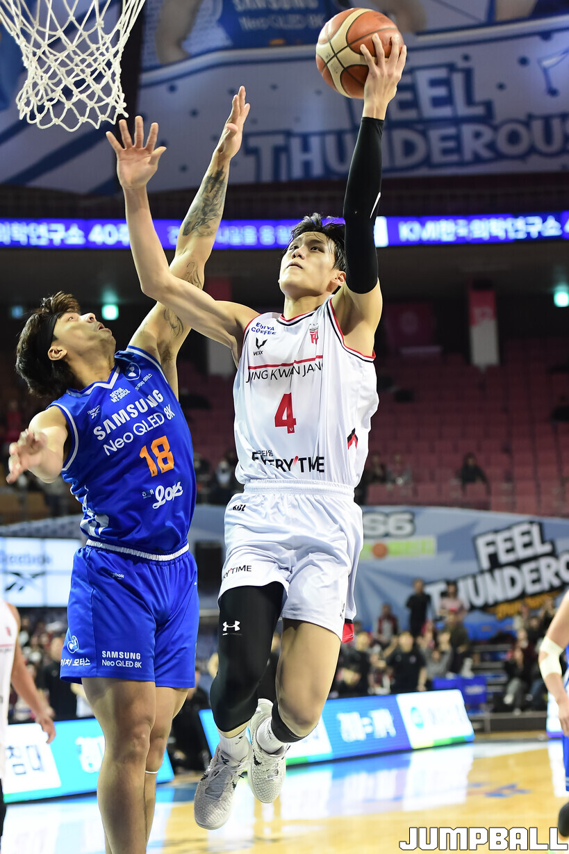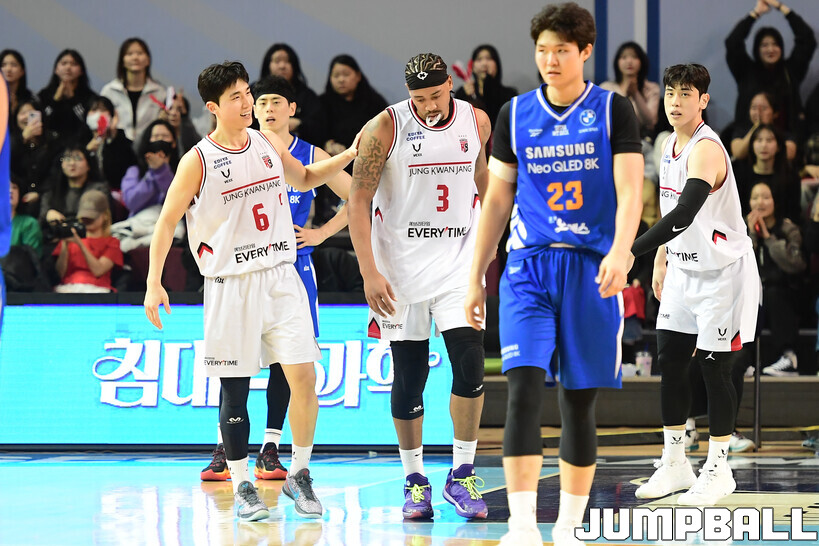 [점프볼=잠실/박상혁 기자] 9일 잠실체육관에서 열린 2025-2026 LG전자 프로농구 서울 삼성과 안양 정관장의 경기, 정관장이 브라이스 워싱턴의 30점과 박지훈, 박정웅, 문유현의 활약으로 케렘 칸터가 20점 10리바운드로 분전한 삼성에 84-79로 승리했다.
