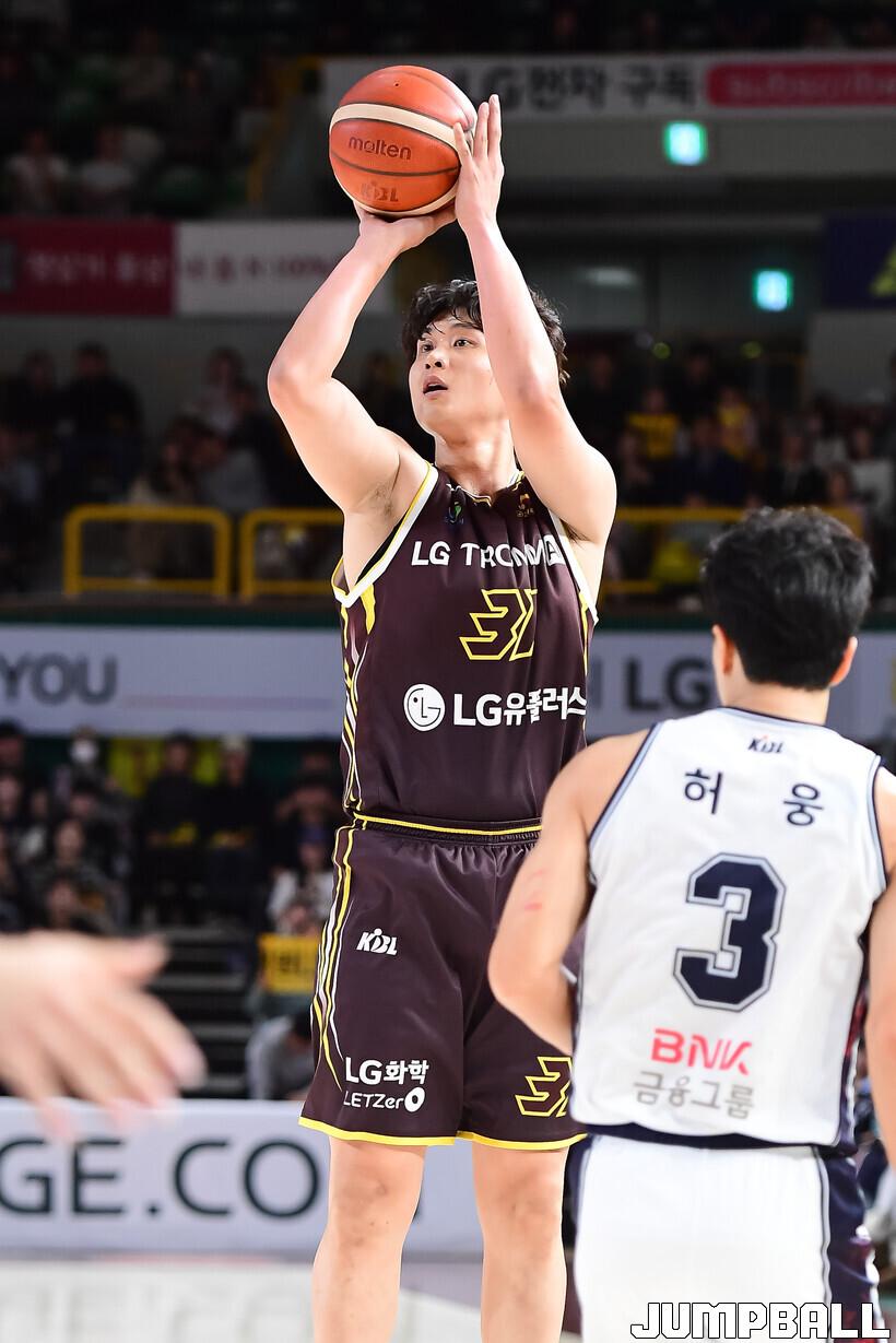 [점프볼=창원/박상혁 기자] 10일 창원체육관에서 열린 2025-2026 LG전자 프로농구 창원 LG와 부산 KCC의 경기, LG 박정현이 슛을 시도하고 있다.