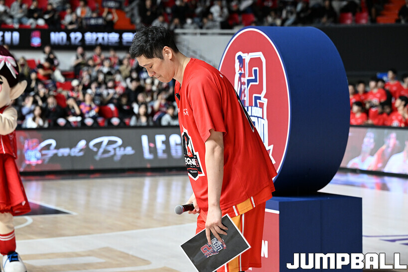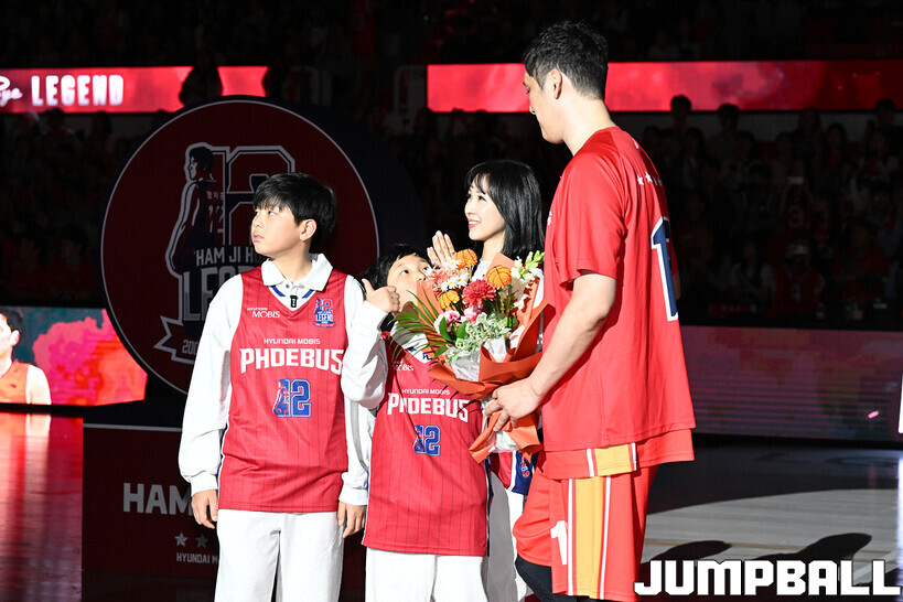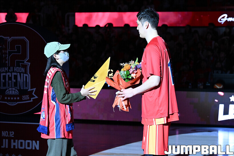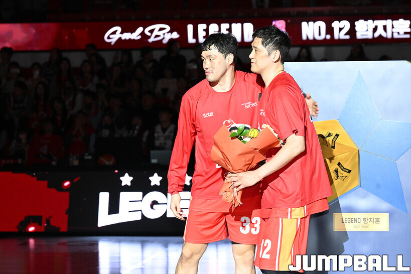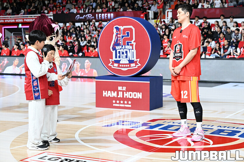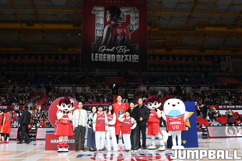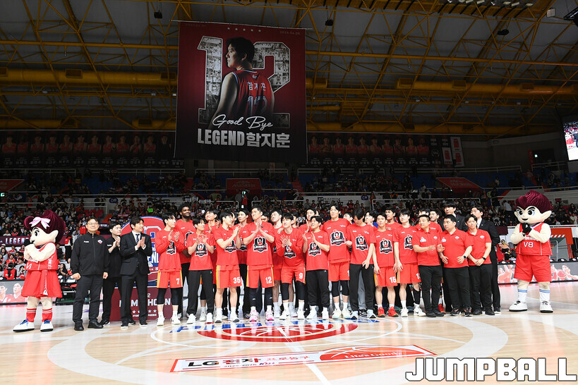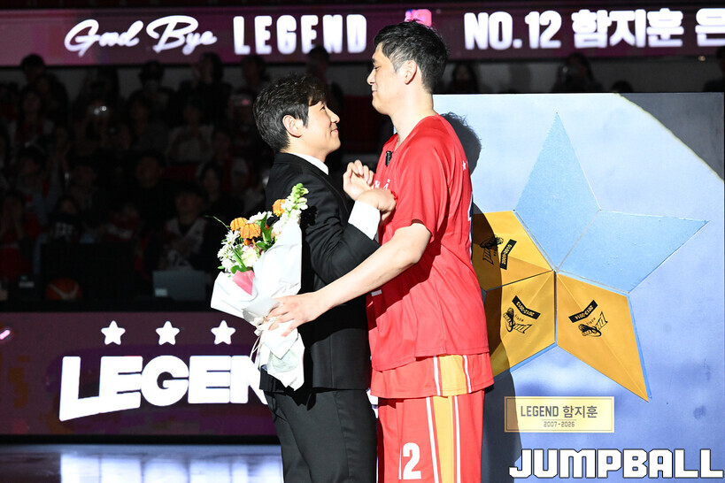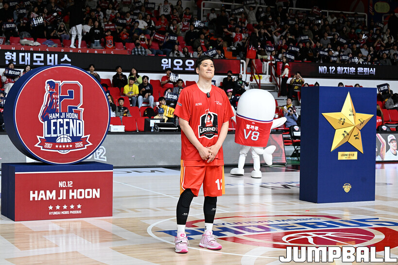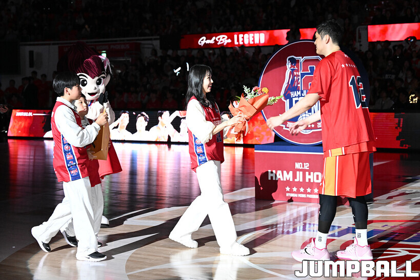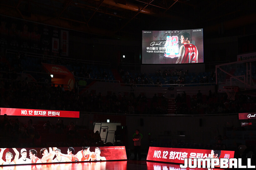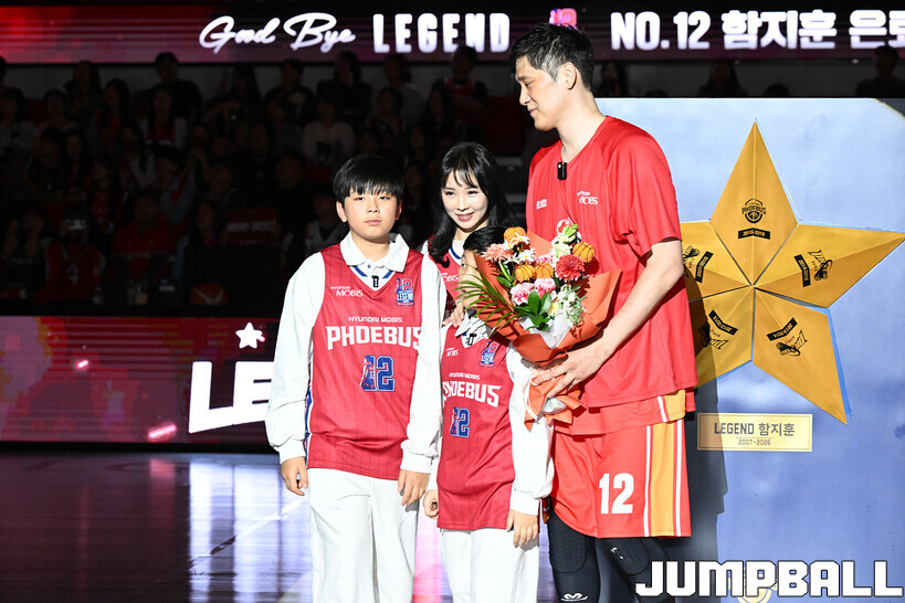 [점프볼=울산/문복주 기자] 울산 현대모비스는 8일 울산동천체육관에서 벌어진 2025-2026 LG전자 프로농구 정규시즌 홈 마지막 창원 LG와의 경기후 함지훈 선수의 은퇴식을 홈 팬들과 선수단의 축하와 격려를 받으며 행사을 진행 했다.