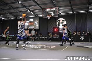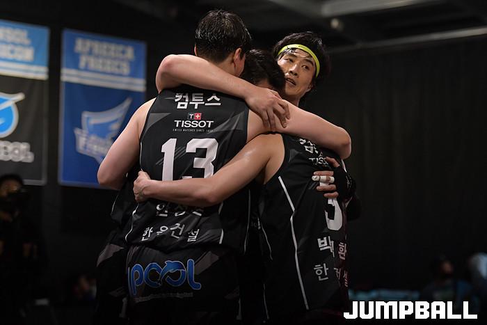 [점프볼=고양/박상혁 기자] 2일 고양 스타필드 스포츠 몬스터 특설코트에서 열린 '컴투스 KOREA 3X3 프리미어리그 2020' 1라운드 경기, 한울건설 선수단이 한솔레미콘에 승리한뒤 서로를 끌어안고 있다.