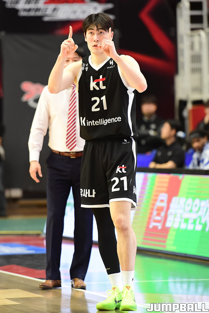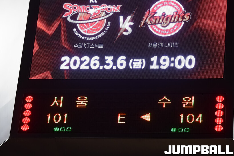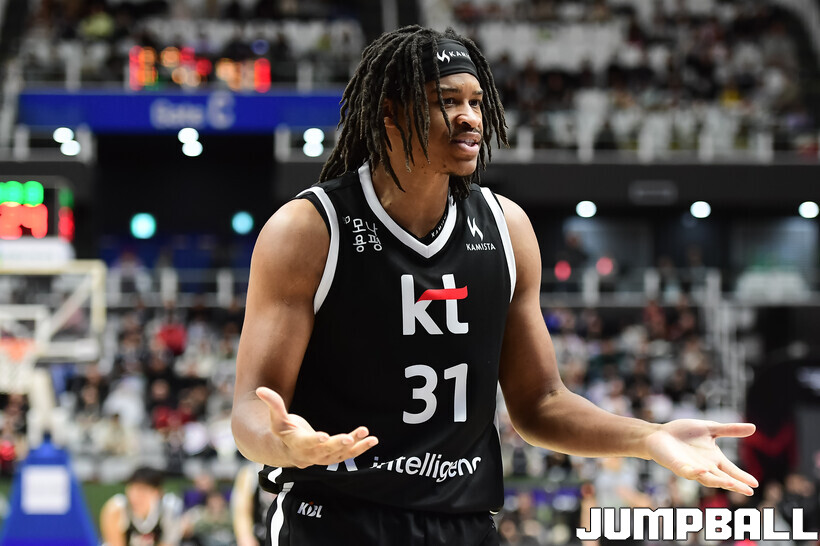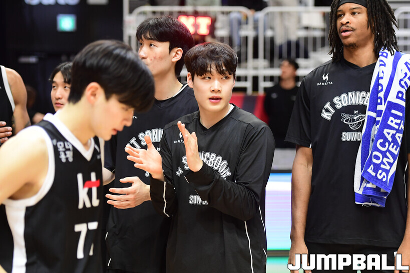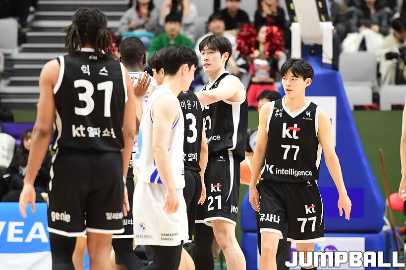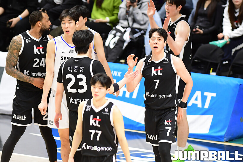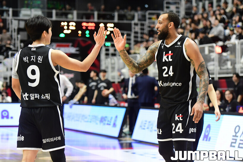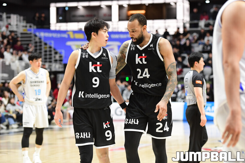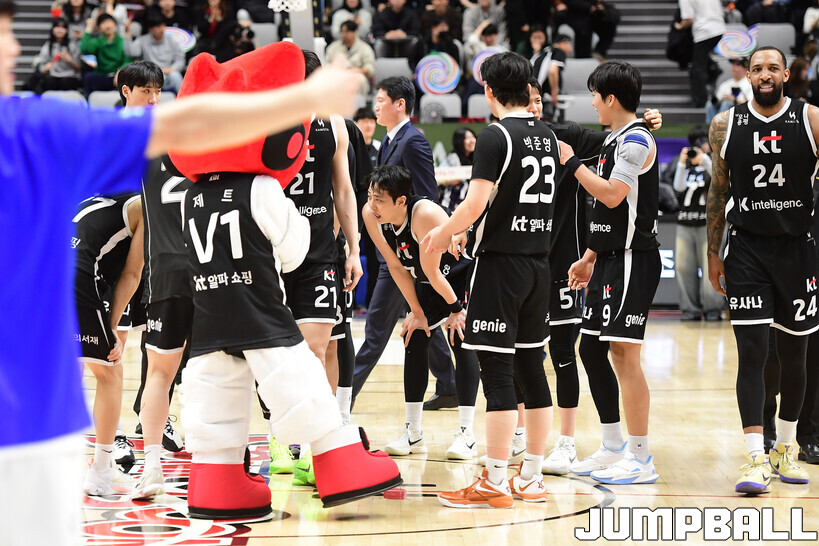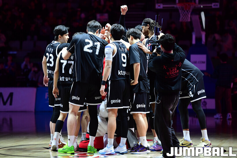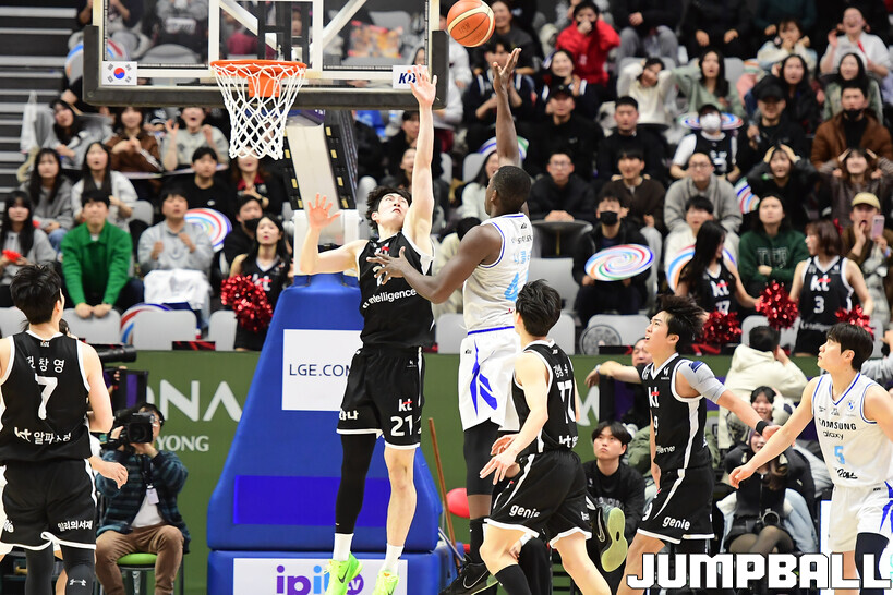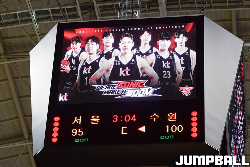 [점프볼=수원/박상혁 기자] 9일 수원 KT 소닉붐 아레나에서 열린 2025-2026 LG전자 프로농구 수원 KT와 서울 삼성의 경기, KT가 연장까지 가는 승부끝에 삼성에 104-101로 승리했다.