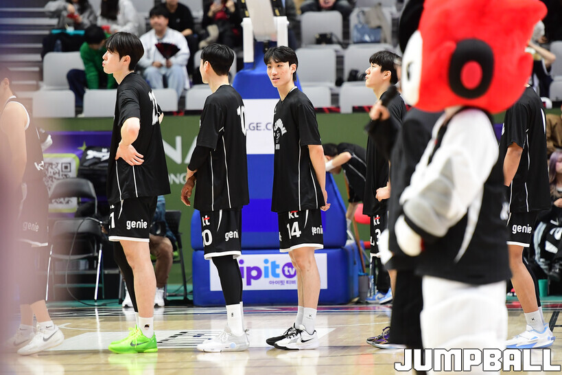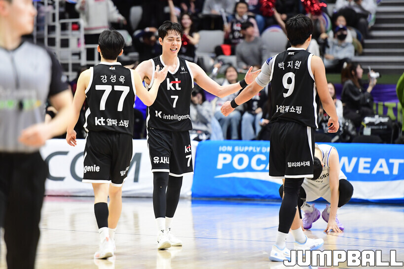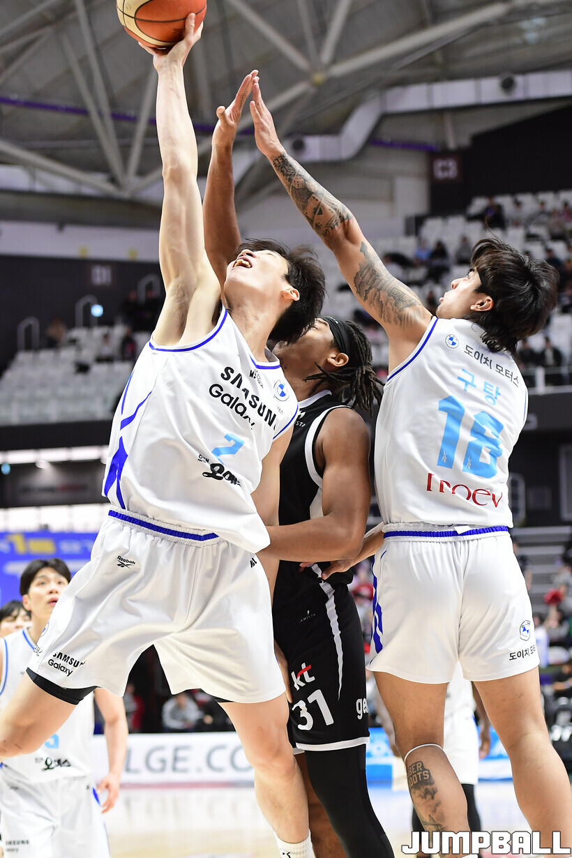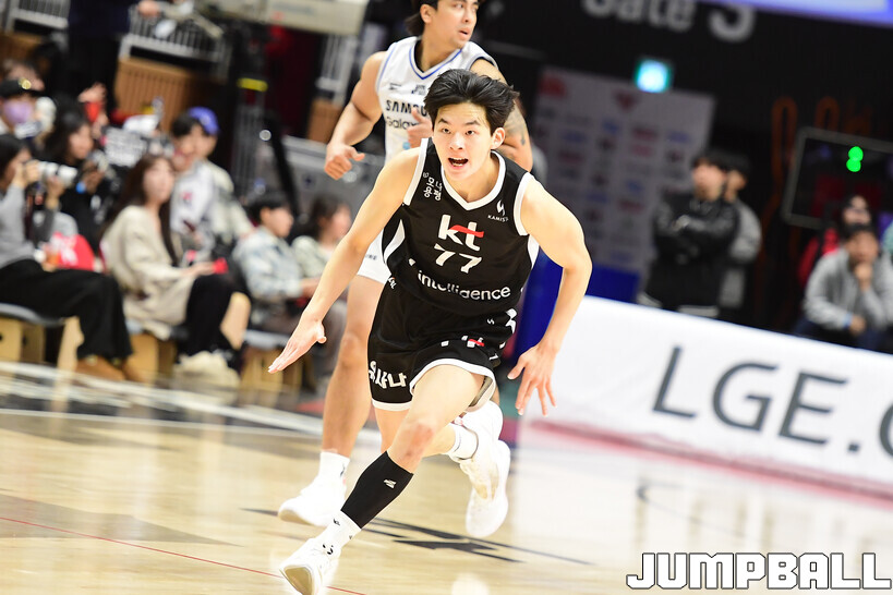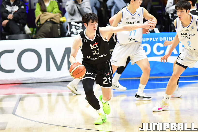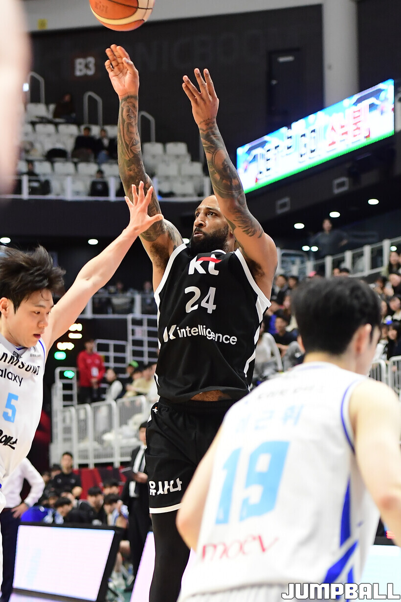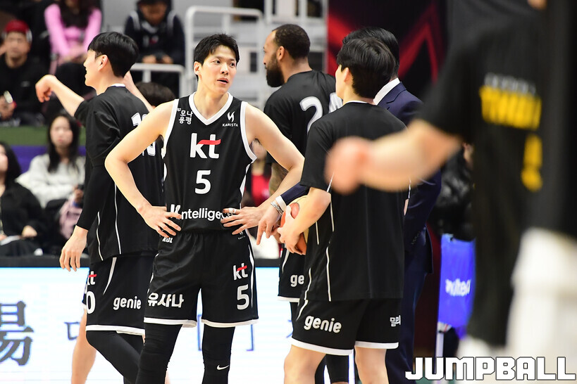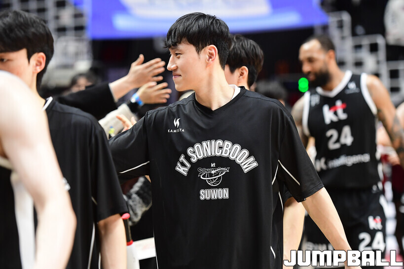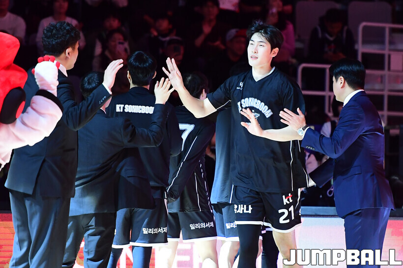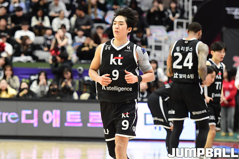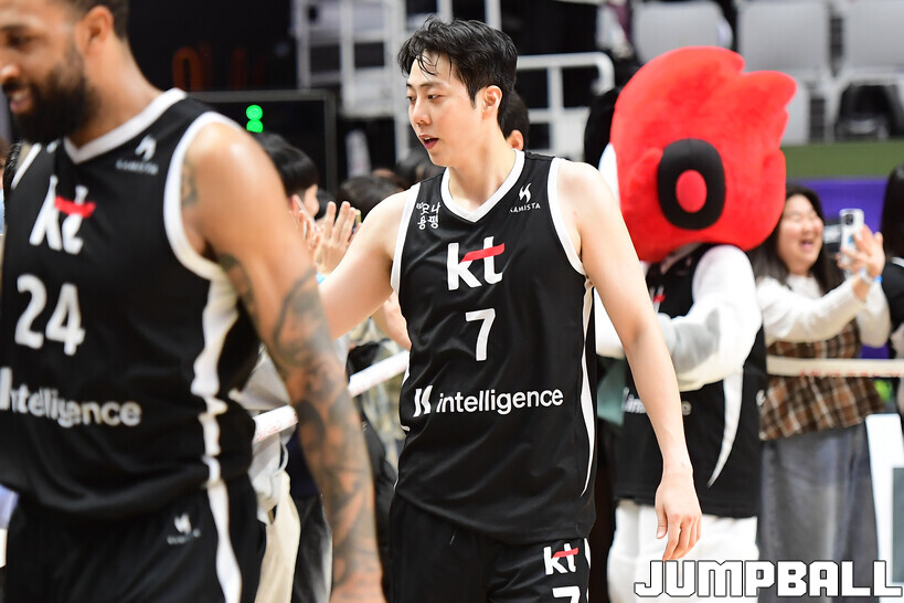 [점프볼=수원/박상혁 기자] 9일 수원 KT 소닉붐 아레나에서 열린 2025-2026 LG전자 프로농구 수원 KT와 서울 삼성의 경기, KT가 연장까지 가는 승부끝에 삼성에 104-101로 승리했다.