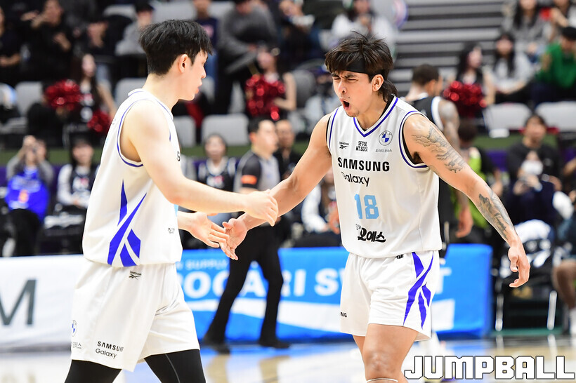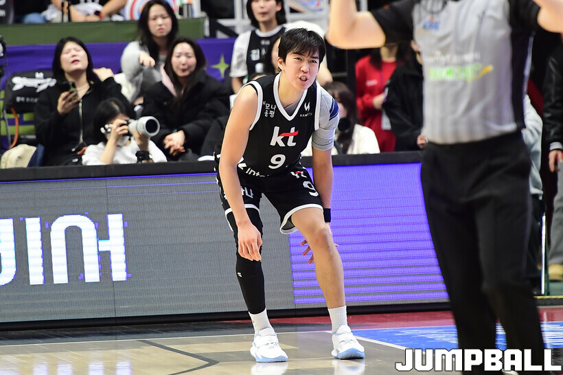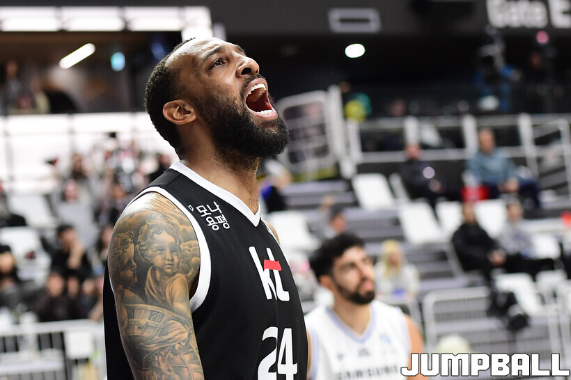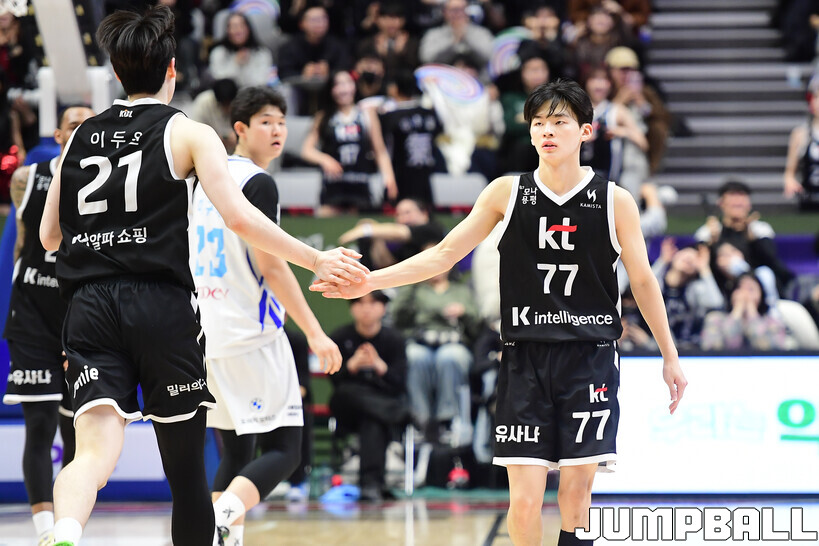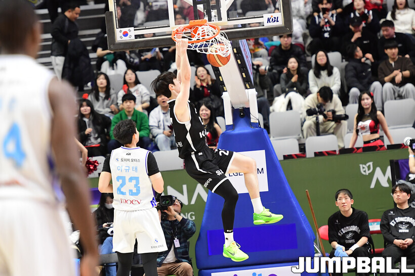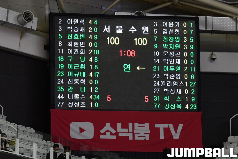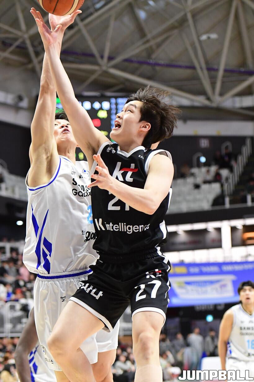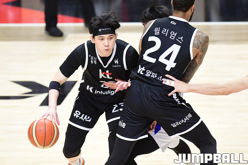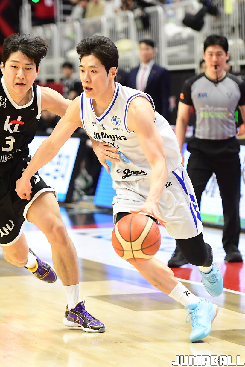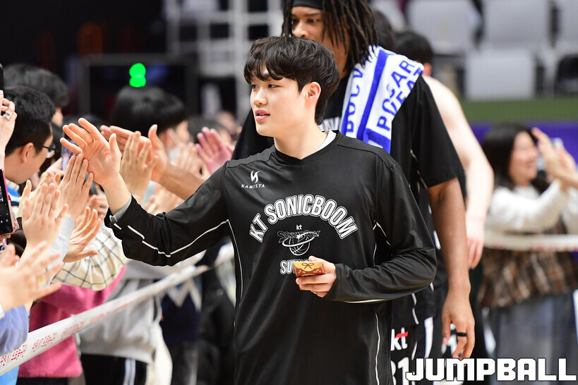 [점프볼=수원/박상혁 기자] 9일 수원 KT 소닉붐 아레나에서 열린 2025-2026 LG전자 프로농구 수원 KT와 서울 삼성의 경기, KT가 연장까지 가는 승부끝에 삼성에 104-101로 승리했다.