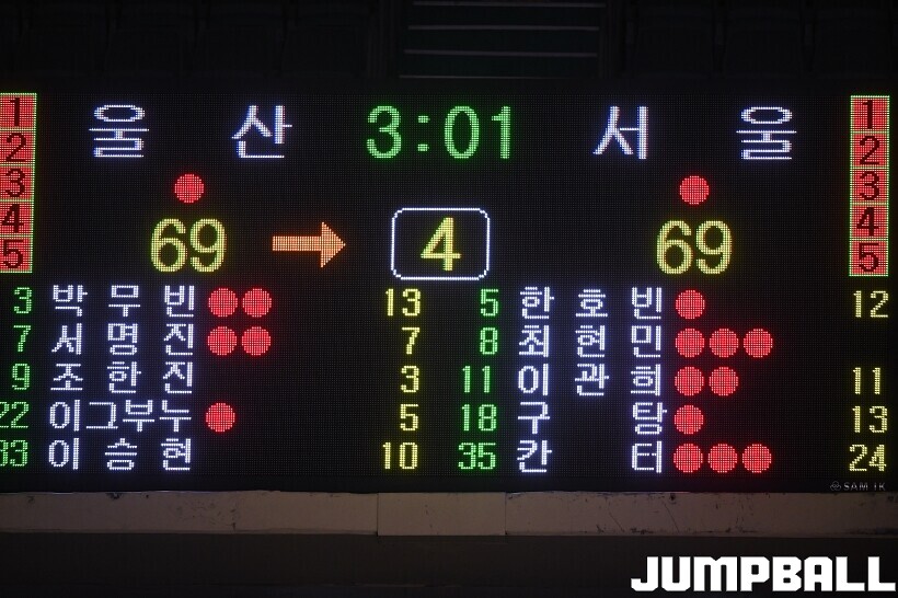 모비스는 레이션 해먼즈 18점 13리바운드 3어시스트 2스틸, 박무빈 13점 3리바운드 8어시스트 1스틸, 이승현 12점 5리바운드 2스틸 1블록으로 분전했지만 마지막 추격에 실패하며 패했다.