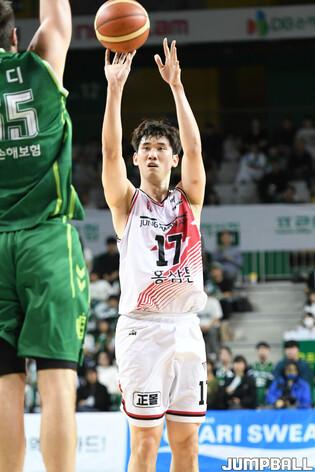[점프볼=원주/박상혁 기자] 23일 원주종합체육관에서 열린 2023-2024 정관장 프로농구 원주 DB와 안양 정관장의 경기, 정관장 이우정이 자밀 윌슨을 일으켜 세워주고 있다.