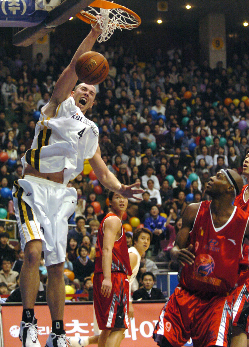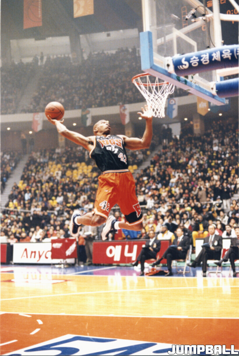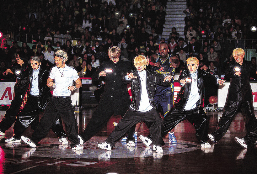 지금은 국내선수, 외국선수를 가리지 않고 축제를 즐기지만 출범 초기 국내선수들은 무대에 나서는 걸 즐기지 않았다. 나이트클럽은 즐기면서 코트에서 춤추는 건 부끄러워했다. 올스타게임의 흥을 돋우는 건 대부분 외국선수들의 몫이었다. 2004년 힙합 그룹 원타임이 ‘HOT 뜨거’를 부를 때 앨버트 화이트, 제이슨 윌리엄스, 앤트완 홀이 즉흥적으로 무대에 나선 건 내가 본 올스타게임 축하 공연 중 최고의 장면이었다. 2000년에는 국민그룹 god가 히트곡 ‘애수’를 선보이자, 레지 타운젠드가 안무를 즉석에서 따라 해 즐거움을 안겼다. 사진만 보면 박준형보다 호흡이 잘 맞는 외국인 백댄서다.
