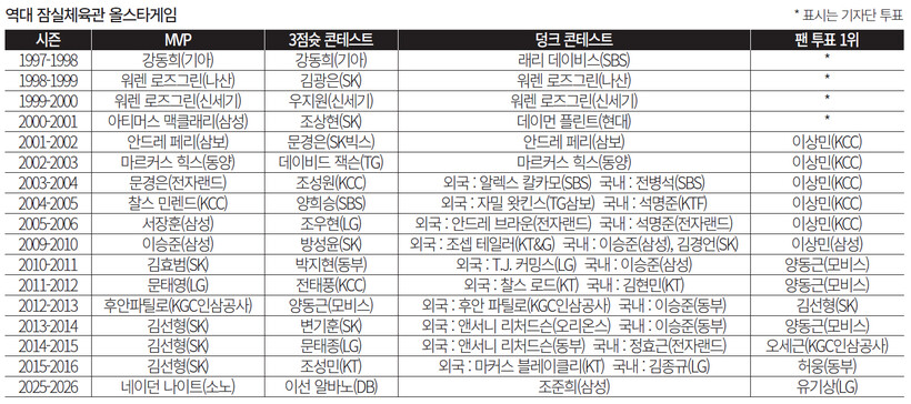 경기가 끝난 후, “소중했던 내 사람아 이젠 안녕~♪”이라는 노래 구절이 울려 퍼지니 새삼 잠실체육관에서의 올스타게임과 관련된 추억이 주마등처럼 스쳐 지나갔다. ‘기억은 기록이 되고 기록이 쌓이면 기억이 된다’라고 했다. 잠실체육관에서 열렸던 올스타게임의 특별했던 순간을 농구 팬들도 영원히 기억하길 바라는 마음을 담아 추억을 화보로 돌아보는 코너를 마련했다.