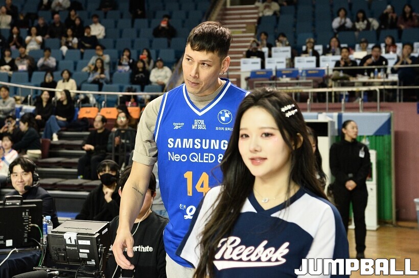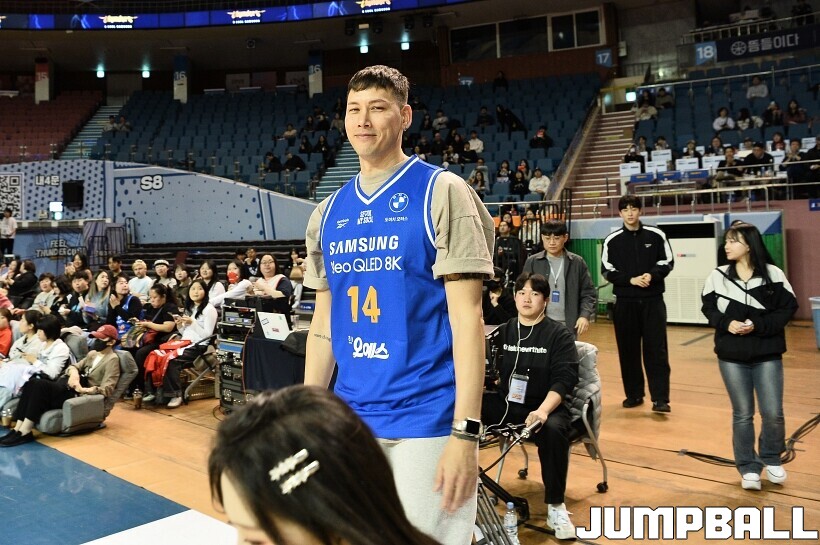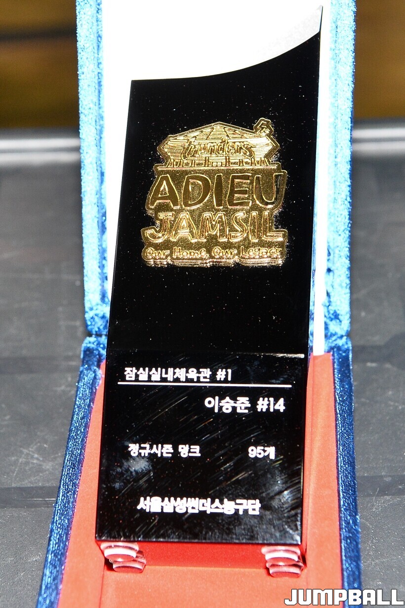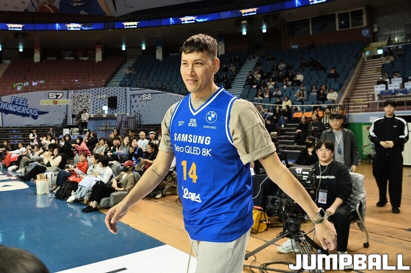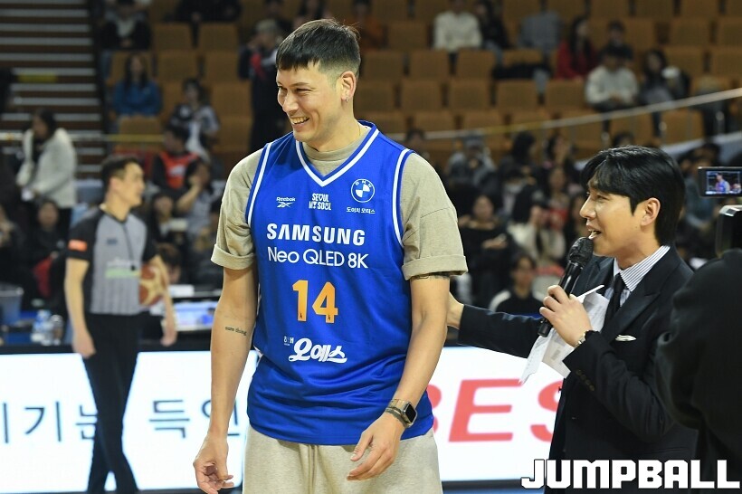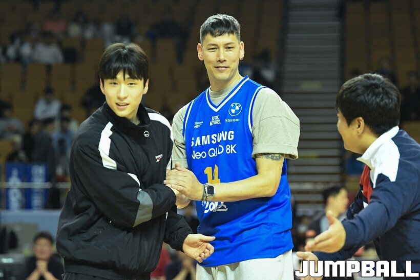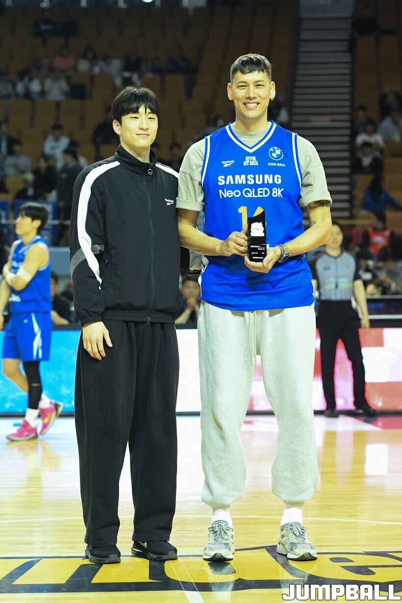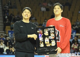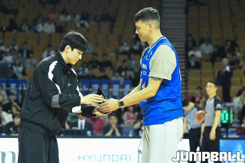 [점프볼=잠실/유용우 기자] 23일 잠실실내체육관에서 열린 2025-2026 LG전자 프로농구 서울 삼성과 울산 현대모비스의 경기, 경기전 잠실실내체육관과의 작별을 앞두고 국내선수 중 잠실내체육관에서 가장 많은 덩크를 성공시킨 전 농구선수 이승준의 기념 시상과 시투가 진행됐다. 이승준은 95개의 덩크를 성공하며 국내선수 중 가장 많은 덩크를 잠실실내체육관에서 기록했다.