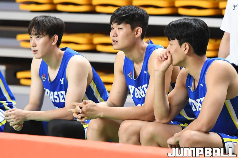 12일 상주체육관 신관에서 열린 제39회 MBC배 전국대학농구 상주대회 연세대와 경희대 경기, 연세대 이채형, 이규태, 김보배가 부상으로 인해 벤치에서 경기를 지켜보고 있다.