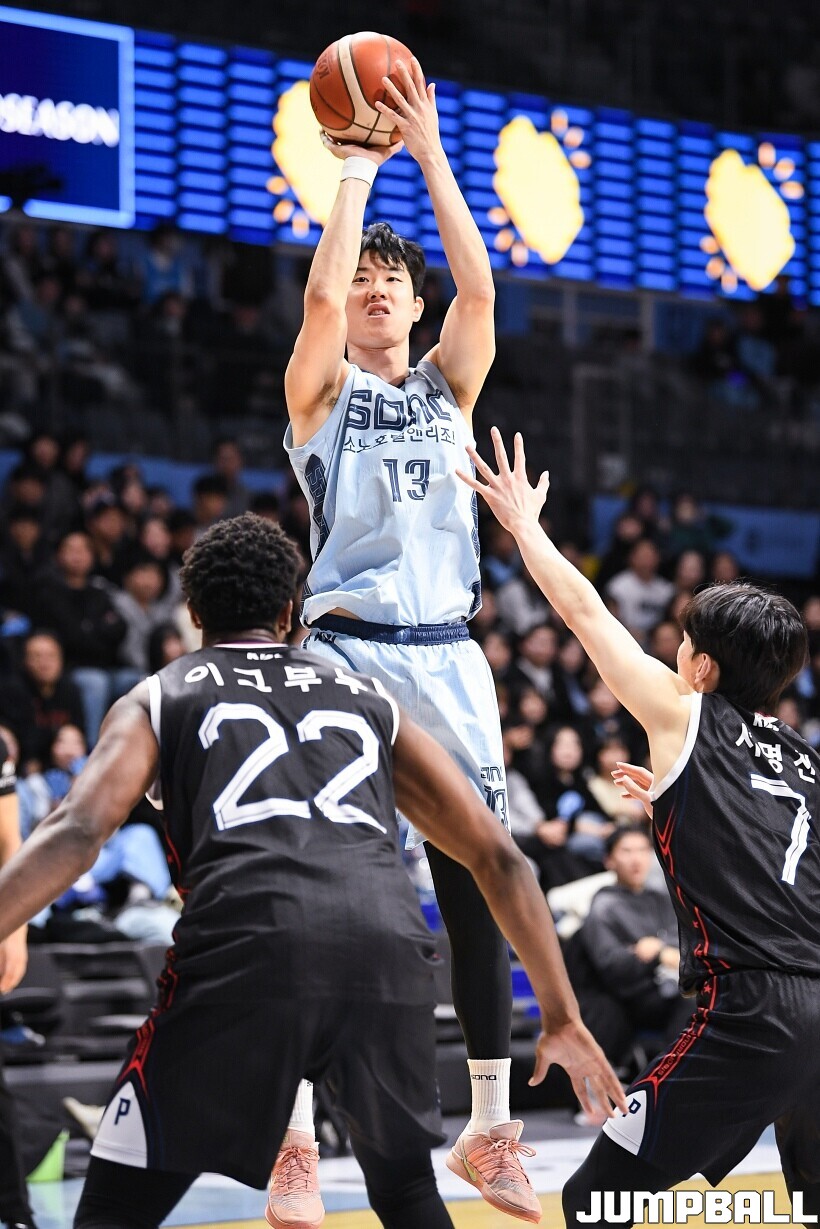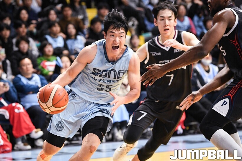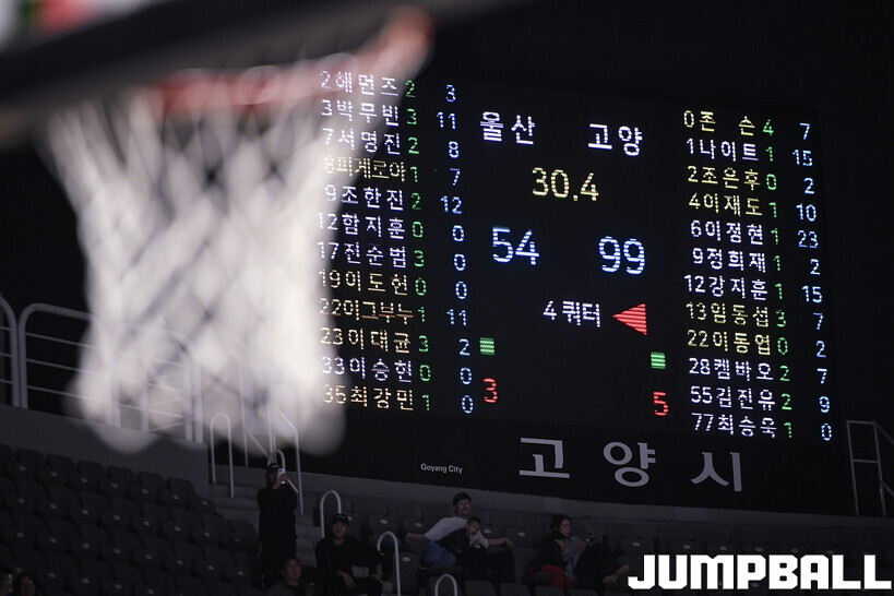 [점프볼=고양/유용우 기자] 27일 고양 소노 아레나에서 열린 2025-2026 LG전자 프로농구 고양 소노과 울산 현대모비스의 경기, 소노가 이정현의 23점 활약에 힘입어 99-54로 현대모비스에 승리했다. 소노는 네이던 나이트와 강지훈이 각각 15점씩, 이재도 10점 등 4명이 두 자릿수 득점을 올리며 대승을 거두었다.