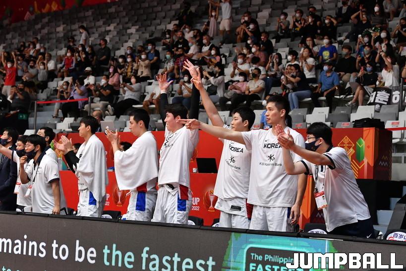 21일 인도네시아 자카르타 이스토라 세네얀에서 열린 FIBA 아시아컵 8강 대한민국과 뉴질랜드의 경기. 대표팀 벤치에 있는 선수들이 환호를 외치고 있다.