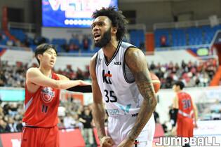 15일 원주실내체육관에서 열린 2023-2024 정관장 프로농구 원주 DB와 부산 KCC의 4강 플레이오프 1차전, KCC가 DB에 95-83으로 승리했다. KCC 라건아는 34점 19리바운드 2어시스트로 맹활약하며 팀의 승리를 이끌었다. [점프볼=원주/유용우 기자]