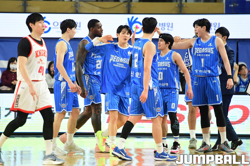[점프볼=대구/박상혁 기자] 19일 대구체육관에서 열린 2025-2026 LG전자 프로농구 대구 한국가스공사와 서울 SK의 경기, 한국가스공사 선수들이 환호하고 있다.
