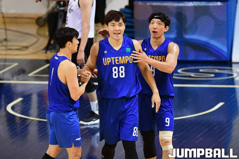 [점프볼=신촌/박상혁 기자] 3일 연세대학교 신촌캠퍼스 체육관에서 열린 '2025 KOREA CUP 최강전' 아울스와 업템포의 준결승 경기, 업템포 노승준과 조용준, 김상훈이 환호하고 있다.