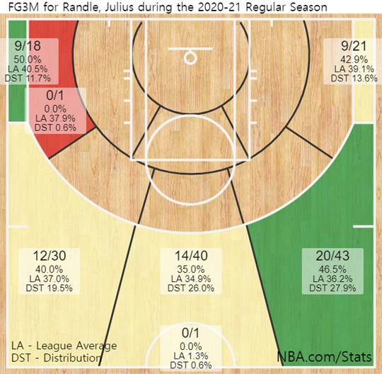 #2020-2021시즌 줄리어스 랜들 3점슛 성공률 분포도(*28일 기준)