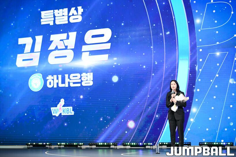 김정은은 지난달 24일 열렸던 하나은행 2024~2025 여자프로농구 정규리그 시상식의 또 다른 주인공이었다. 김정은은 심판부를 대상으로 진행된 투표를 통해 모범선수상을 수상한 데 이어 특별상의 영예까지 안았다. 통산 8333점을 기록, 정선민(은퇴, 8102점)을 제치고 이 부문 1위로 올라선 것을 기리기 위한 상이었다.