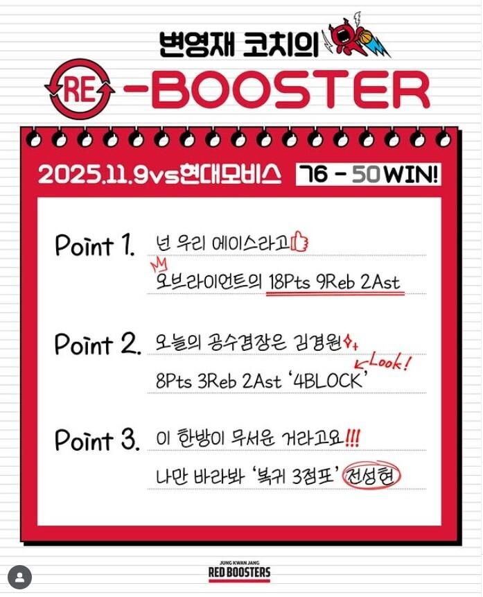 정관장은 승리하는 경기마다 공식 소셜미디어 채널에 ‘변영재 코치의 RE-BOOSTER’라는 게시물을 업로드하고 있다. 변영재 코치가 직접 작성하는 일기로 해당 경기의 중요했던 포인트와, 선수들을 칭찬하는 멘트가 담겨있다.