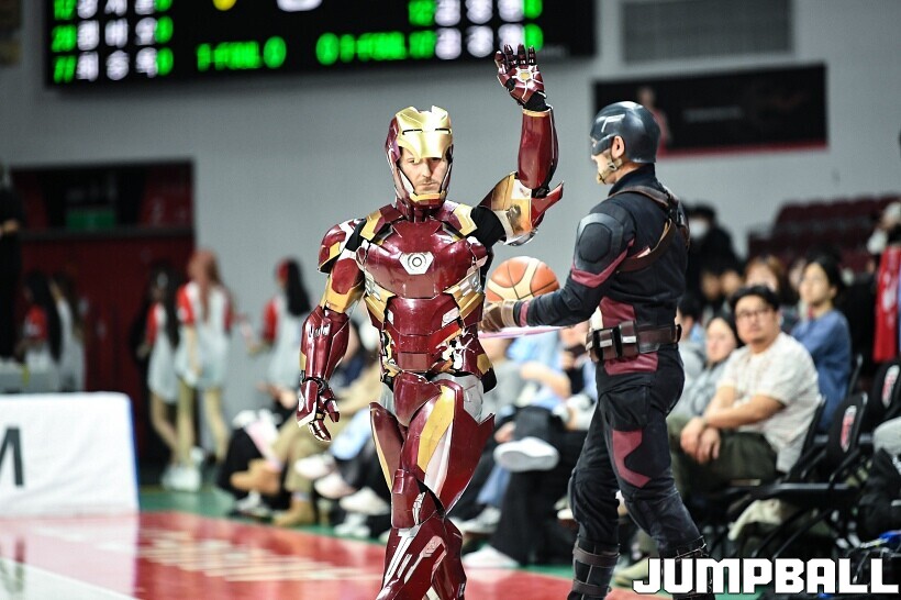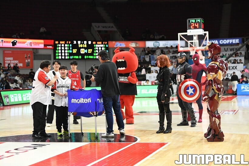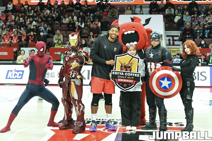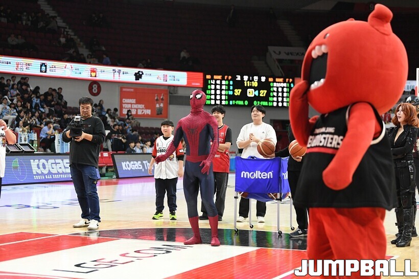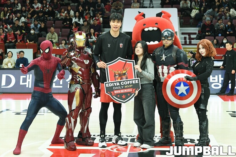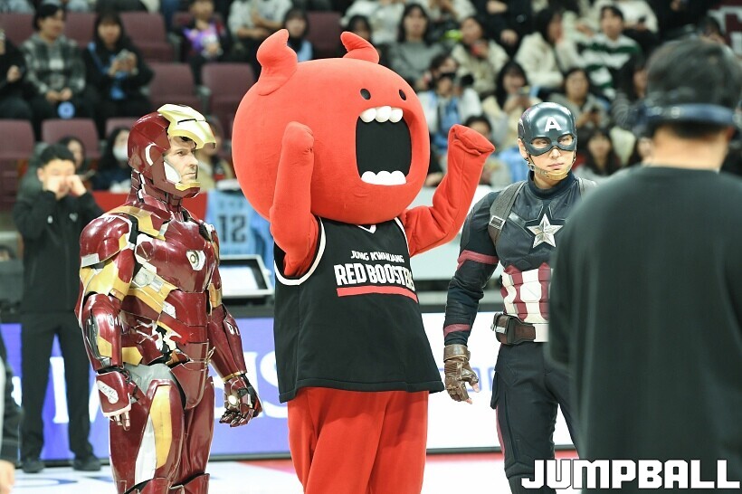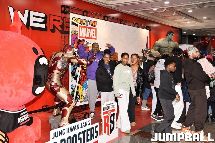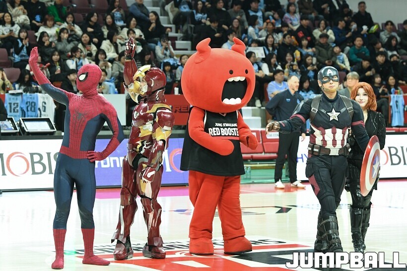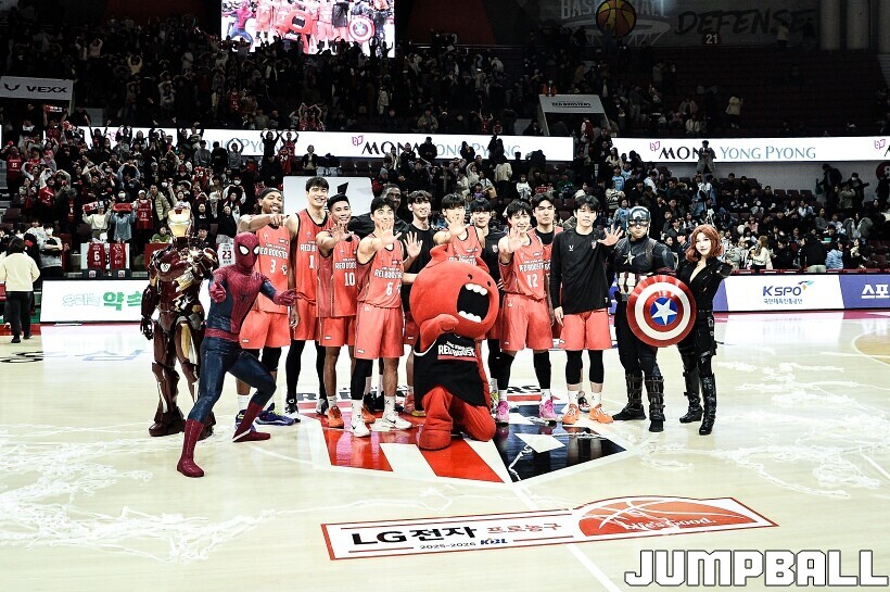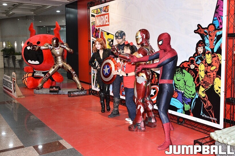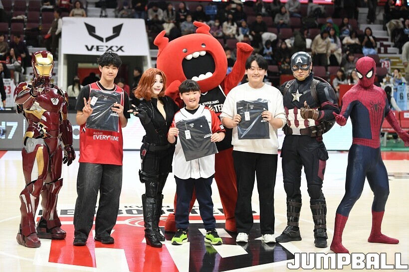 [점프볼=안양/유용우 기자] 23일 안양 정관장 아레나에서 열린 2025-2026 LG전자 프로농구 안양 정관장과 고양 소노의 경기, 해당 경기는 월트디즈니 컴퍼니 코리아와 협업하여 마블 테마의 경기 이벤트 ‘마블 매치(MARVEL MATCH)’로 개최됐다. 현장에는 마블 캐릭터 코스튬을 입은 마블 히어로들이 팬들이 함께하는 포토존, ‘응원타임’, ‘하프타임 코트 이벤트’ 등 다양한 참여형 프로그램이 진행됐다.
