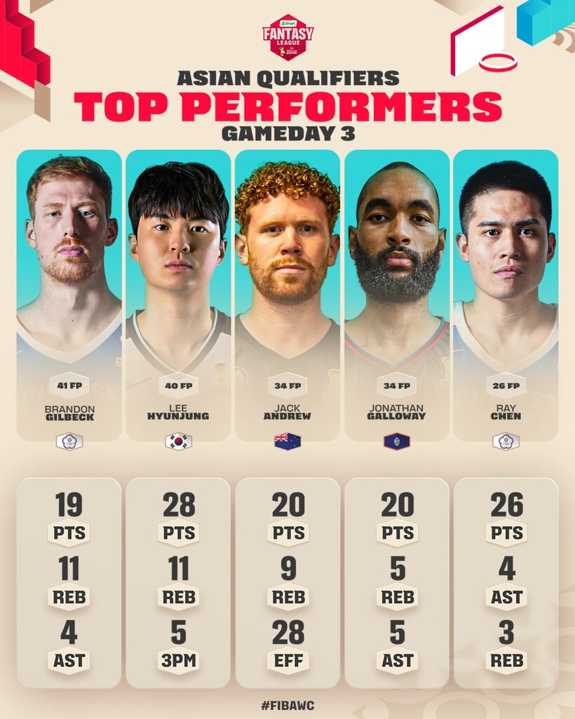 FIBA(국제농구연맹)는 2일(한국시간) 공식 홈페이지를 통해 2027 FIBA 농구 월드컵 아시아 예선 1라운드 3차전 탑 퍼포머스 5명을 공개했다. 윈도우-2 두 번째 경기에서 인상적인 활약을 펼친 5인을 직접 꼽은 것.