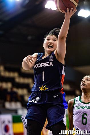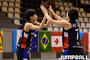 10일 헝가리 데브레첸 올라가보르 스포츠홀에서 열린 '2021 FIBA U19 여자농구월드컵' 한국과 브라질의 조별 예선 3차전 경기, 변소정이 득점을 성공시킨후 박소희와 하이파이브를 하고 있다.