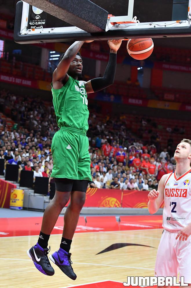 [점프볼=우한(중국)/홍기웅 기자] 31일 중국 우한스포츠센터에서 열린 '2019 FIBA 농구월드컵' 러시아와 나이지리아의 경기. 나이지리아 메튜가 덩크를 내리꽂고 있다.