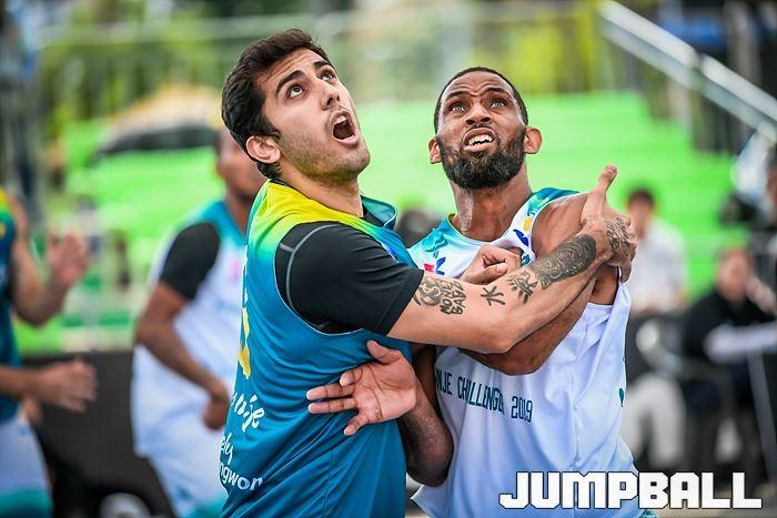 [점프볼=인제/유용우 기자] 31일 강원도 인제군 정중앙휴게소 특설코트에서 열린 FIBA 3x3 인제 챌린저 2019 1일차 경기가 열렸다. 미국 팀 뉴욕할램의 시거스가 리바운드 박스아웃 경쟁을 벌이고 있다.