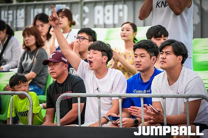 [점프볼=인제/유용우 기자] 31일 강원도 인제군 정중앙휴게소 특설코트에서 열린 FIBA 3x3 인제 챌린저 2019 1일차 경기가 열렸다. 한국팀의 경기를 관전하며 응원전을 펼치고 있다.