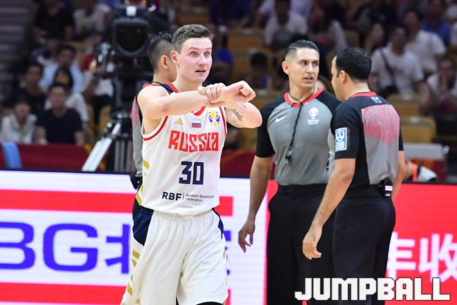 [점프볼=우한(중국)/홍기웅 기자] 31일 중국 우한스포츠센터에서 열린 '2019 FIBA 농구월드컵' 러시아와 나이지리아의 경기. 러시아 쿨라긴이 U파울을 당했다고 심판에게 강조하고 있다.
