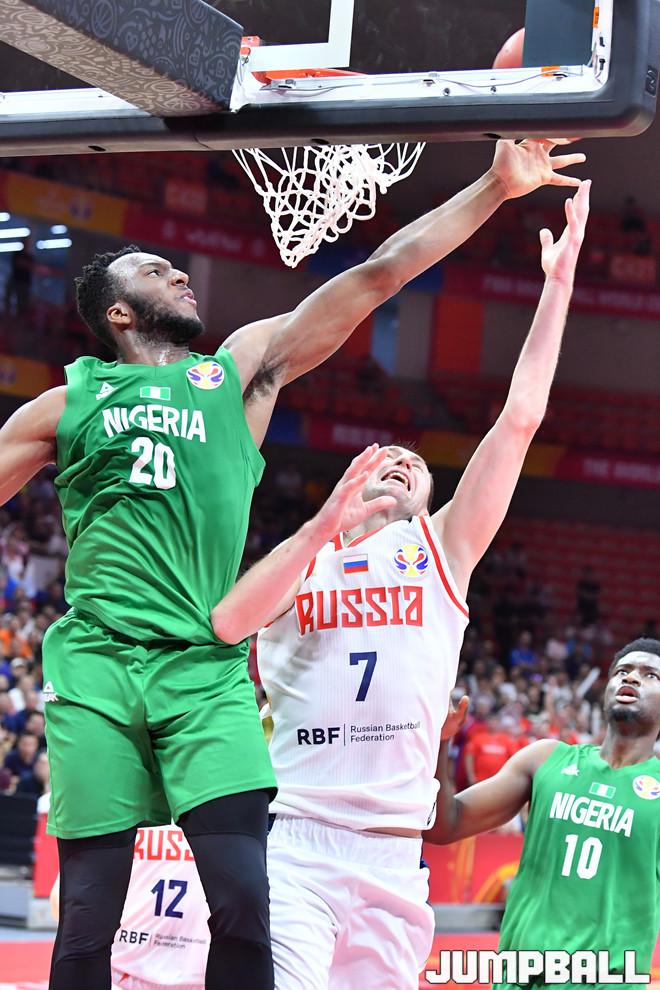 [점프볼=우한(중국)/홍기웅 기자] 31일 중국 우한스포츠센터에서 열린 '2019 FIBA 농구월드컵' 러시아와 나이지리아의 경기. 나이지리아 오코기가 블록슛을 하고 있다.