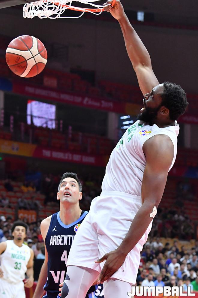 [점프볼=우한(중국)/홍기웅 기자] 2일 중국 우한스포츠센터에서 열린 '2019 FIBA 농구월드컵' 나이지리아와 아르헨티나의 경기. 나이지리아 디오구가 원핸드 덩크를 내리 꽂고 있다.