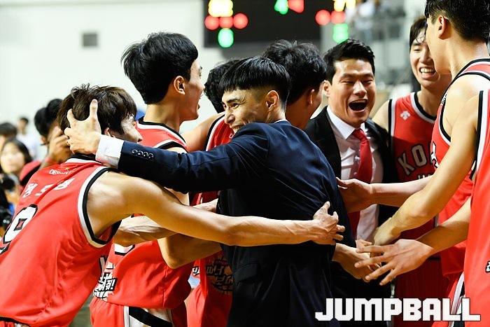 [JB포토] 승리의 기쁨을 나누는 고려대 주희정 감독대행