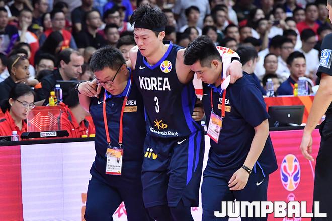 [점프볼=광저우(중국)/홍기웅 기자] 6일 중국 광저우체육관에서 '2019 FIBA 농구월드컵 순위결정전' 중국과 한국의 경기. 이정현이 부상을 당해 부축을 받으며 벤치로 향하고 있다.