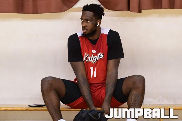 SK 자밀 워니가 연습을 마친후 짐을 정리하면서 KCC 선수들을 바라보고 있다.