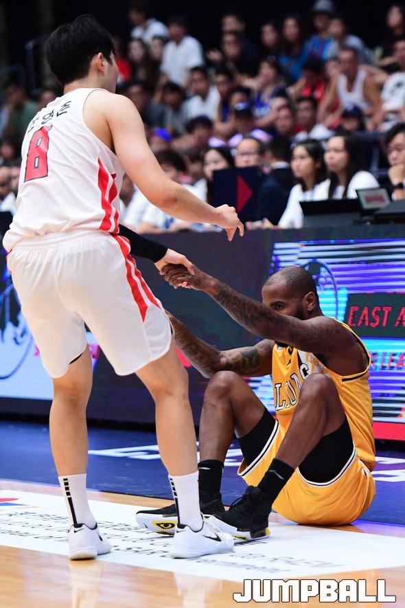 [점프볼=마카오/박상혁 기자] 21일 마카오 탑섹 멀티스포츠 파빌리온에서 열린 '동아시아 슈퍼리그 터리픽 12' 서울SK와 저장 광샤 라이언즈의 경기, 저장 광샤 라이언즈의 잭슨이 SK 안영준의 도움으로 일어나고 있다.