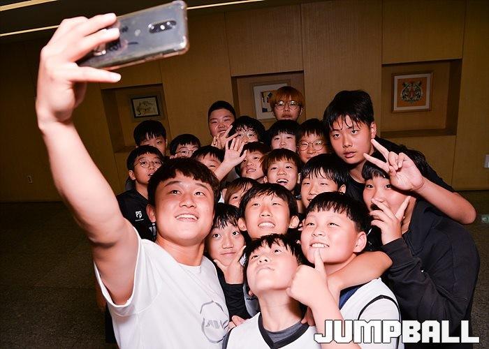 초등부 참가자들이 코끼리프렌즈의 한준혁 선수와 사진을 찍고 있다. 한준혁은 유튜브를 통해 다양한 농구 컨텐츠를 선보이며 농구팬들과 소통하고 있다.