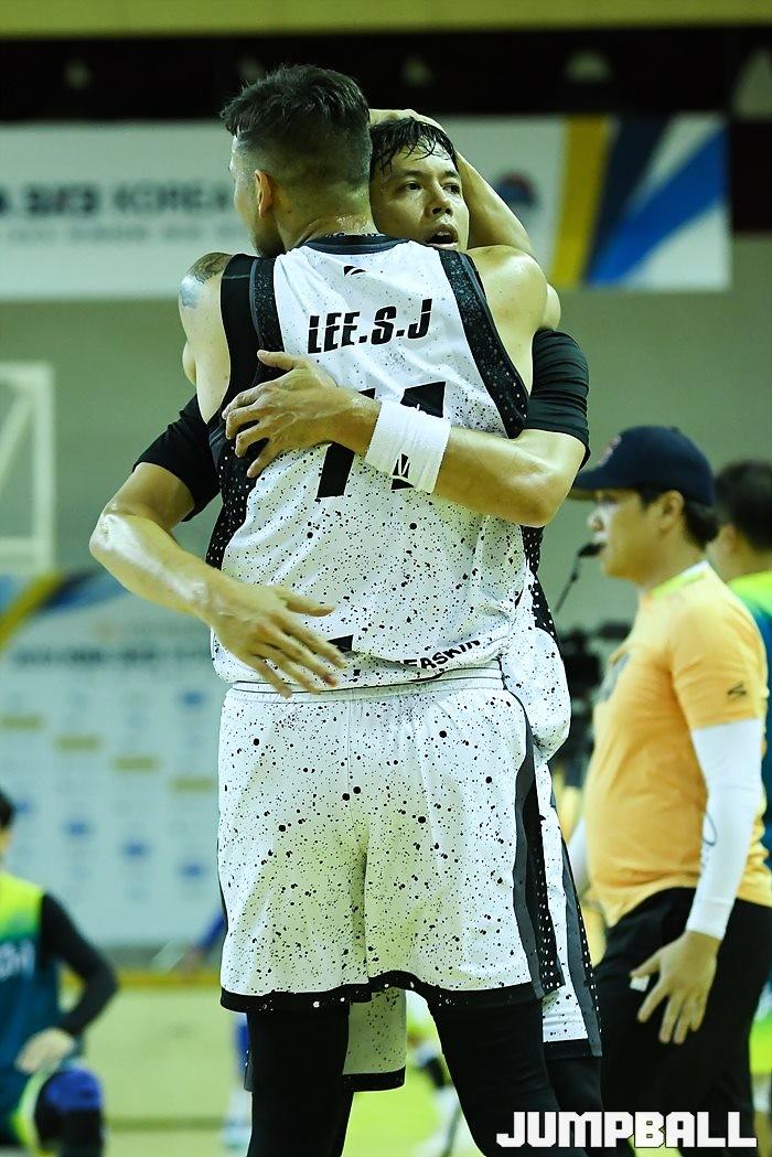 [점프볼=강남/유용우 기자] 22일 서울 강남구 일원동에 위치한 중동고등학교에서 열린 ‘KB국민은행 리브(LiiV) 2019 KBA 3x3 코리아투어 파이널’ 2일차, 오픈부 4강 하늘내린인제와 에너스킨의 경기에서 에너스킨 이승준이 위닝샷을 성공한 동생 이동준을 끌어 안고 있다.