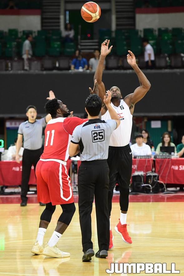 [점프볼=잠실학생/박상혁 기자] 30일 잠실학생체육관에서 열린 프로농구 서울SK와 안양KGC인삼공사의 연습경기, 두 팀간의 경기가 점프볼로 시작되었다.