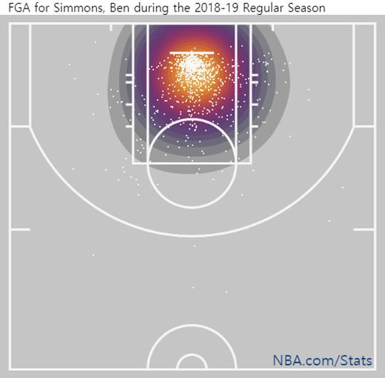 #2018-2019시즌 정규리그 벤 시몬스 야투 시도 히트맵