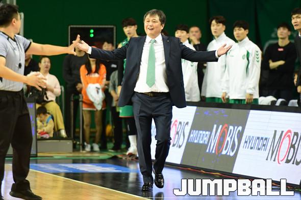 [점프볼=원주/박상혁 기자] 6일 원주종합체육관에서 열린 '2019-2020 현대모비스 프로농구' 원주DB와 전주KCC의 경기, DB 이상범 감독이 심판에게 항의를 하고 있다.