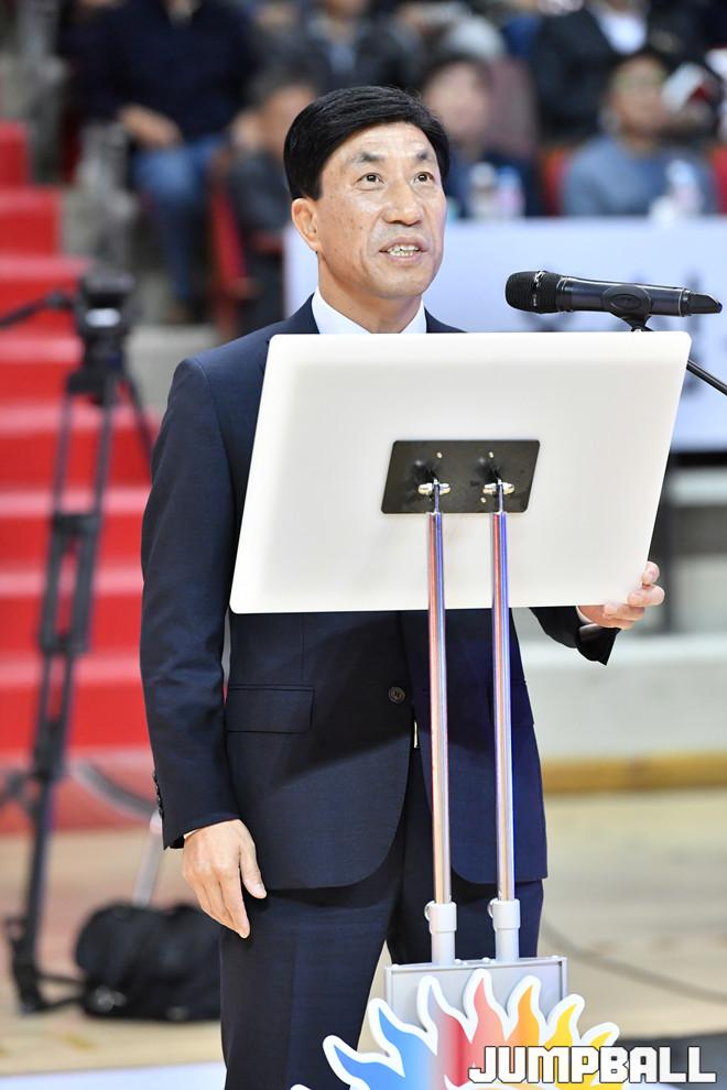[점프볼=안양/홍기웅 기자] 6일 안양실내체육관에서 열린 '2019-2020 현대모비스 프로농구' 안양 KGC와 창원 LG의 경기. KGC 김재수 구단주가 KGC 홈 개막을 알리기 위해 개회사를 전하고 있다.