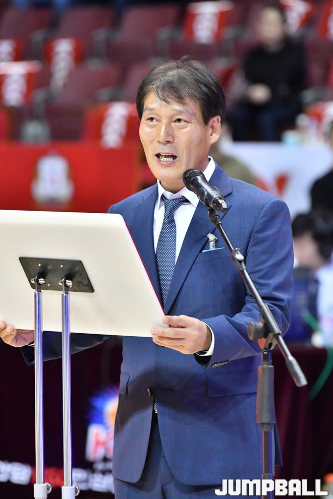 [점프볼=안양/홍기웅 기자] 6일 안양실내체육관에서 열린 '2019-2020 현대모비스 프로농구' 안양 KGC와 창원 LG의 경기. KGC 전삼식 단장이 KBL 홈코트 개회를 선언하고 있다.