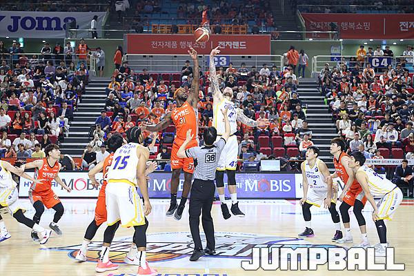 [점프볼=인천/한명석 기자] 6일 인천삼산체육관에서 열린 '2019-2020 현대모비스 프로농구' 인천전자랜드와 서울삼성과의 경기를 알리는 점프볼을 시작하고 있다.
